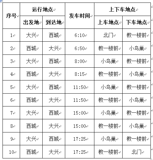 1.6:10大兴开往西城的班车,上车地点改在北门;其余大兴开往西城的班车,上车地点均在基础楼A座报告厅(小鸟巢);